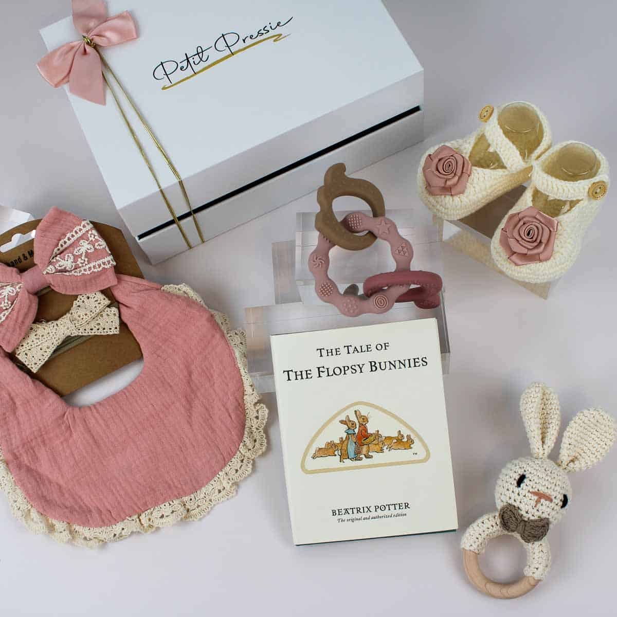 Celebrate a new arrival with the “Baby’s First Treasures – Pink Welcome Gift Box.” This charming set includes a crochet bunny, handmade booties, a cozy bib with matching hair bows, a soothing teether, and “The Tale of The Flopsy Bunnies” book, perfect for creating lasting memories.