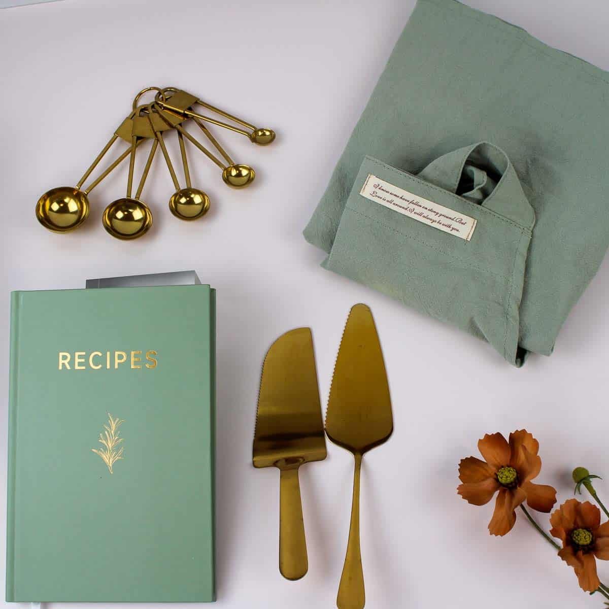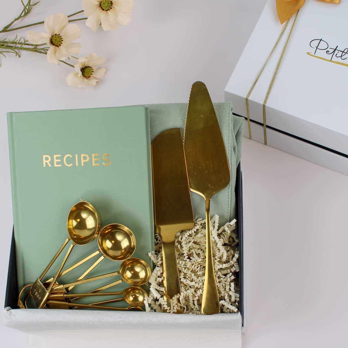 Gift the “Gourmet Baker’s Essentials – Culinary Gift Box,” featuring a mint green recipe journal, gold-plated measuring spoons, and an elegant cake server and knife. Perfect for bakers and cooking enthusiasts, combining style and functionality.